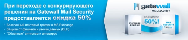- возможность приобретения GateWall Mail Security со скидкой 50% от стоимости, указанной в прайс-листе. Скидка предоставляется на то же количество ящиков, которое указано в лицензионном соглашении стороннего ПО. Скидка не распространяется на встроенные дополнительные модули;