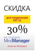 специальные цены на одиночные лицензии-подписки MindManager 2019 для Windows и MindManager 11 MAC: при покупке даже 1 лицензии владельцы ПП 1С могут приобрести продукт со скидкой 30% от действующего прайс-листа. Подписка представляет лицензию, которая дает право аренды ПО MindManager сроком на 365 дней с возможностью дальнейшего продления. Имея подписку, пользователь получает обновления до следующей версии в течение всего срока действия подписки без дополнительной платы. Таким образом, новейшие инструменты и усовершенствования продукта всегда будут под рукой.