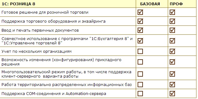 Сравнение функционала между "1С:Розница" и "1С:Управление торговлей"