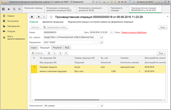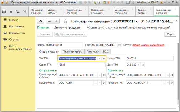 - передачу информации в типовые программные продукты "1С" о сформированных электронных ветеринарных сопроводительных документах.