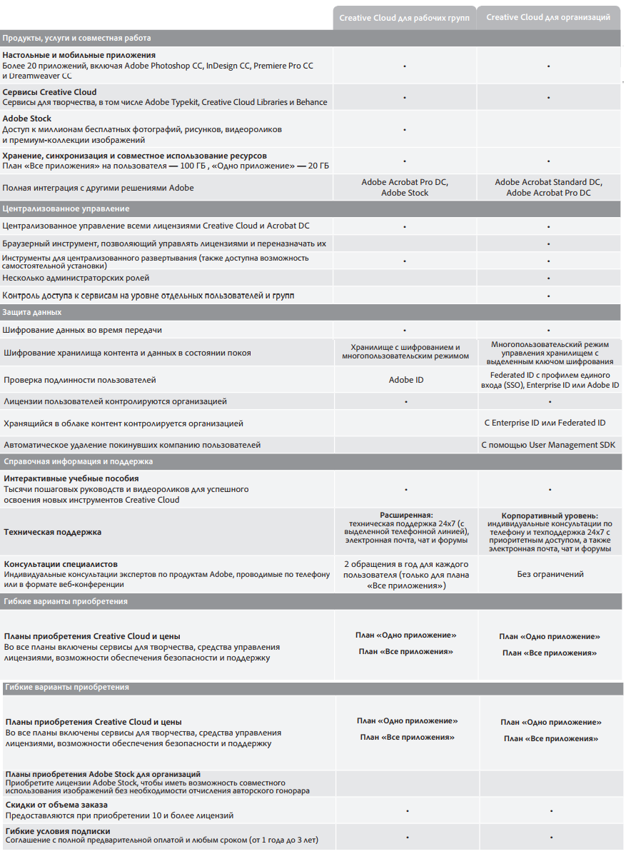 Компания Adobe предлагает два плана подписки на Creative Cloud для рабочих групп: полный план и план подписки на одно приложение.