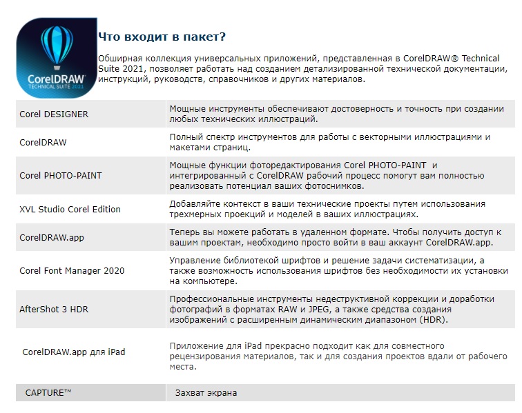 Пакет оснащен разнообразными приложениями для создания всевозможных проектов — от высокоточных технических иллюстраций (Corel DESIGNER) и запоминающихся маркетинговых материалов (CorelDRAW) до снимков экрана (CAPTURE) и отредактированных фотографий для использования в документации (Corel PHOTO-PAINT). Веб-приложение CorelDRAW.app, посредством которого реализуется коллаборативный рабочий процесс, позволяет существенно оптимизировать сбор отзывов, а также проверку, редактирование и утверждение проектных материалов.