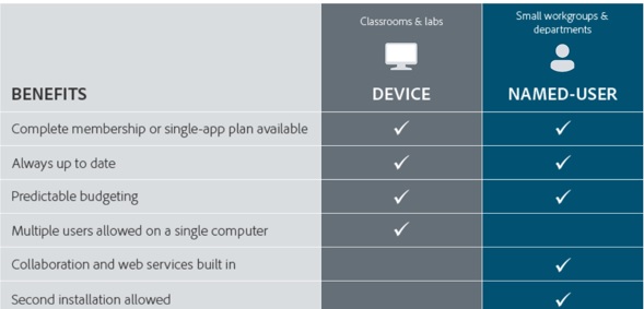 - Лицензии типа Named-user включают в себя не только все преимущества участия в программе как с полным пакетом, так и с одним приложением, но и множество дополнительных сервисов. Лицензии типа Device развертываются на конкретном компьютере, а не назначаются человеку. По этой причине лицензия на устройство не включает в себя ни одну из служб, которые включены в лицензию на пользователя.