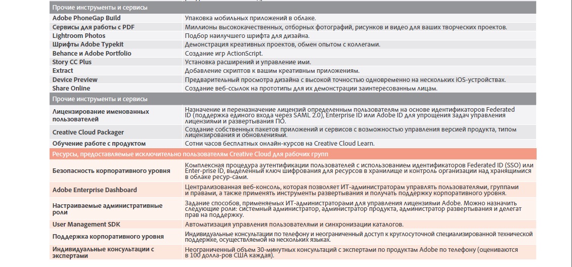 Ваши сотрудники могут воспользоваться сотнями интерактивных обучающих видеопособий любого уровня сложности, доступных через браузер, на планшетах и даже непосредственно в приложениях Adobe. Кроме того, в рамках программы Expert Services им предлагаются неограниченные по времени индивидуальные телефонные консультации с экспертами Adobe для решения рабочих вопросов и максимально эффективного использования новых функций.