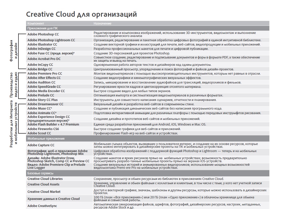 Набор межплатформенных приложений от Adobe Systems, распространяемых по подписке, который предоставляет пользователям доступ к коллекции программного обеспечения для графического дизайна, редактирования фото и видео, веб-разработки, а также доступа к облачным услугам.