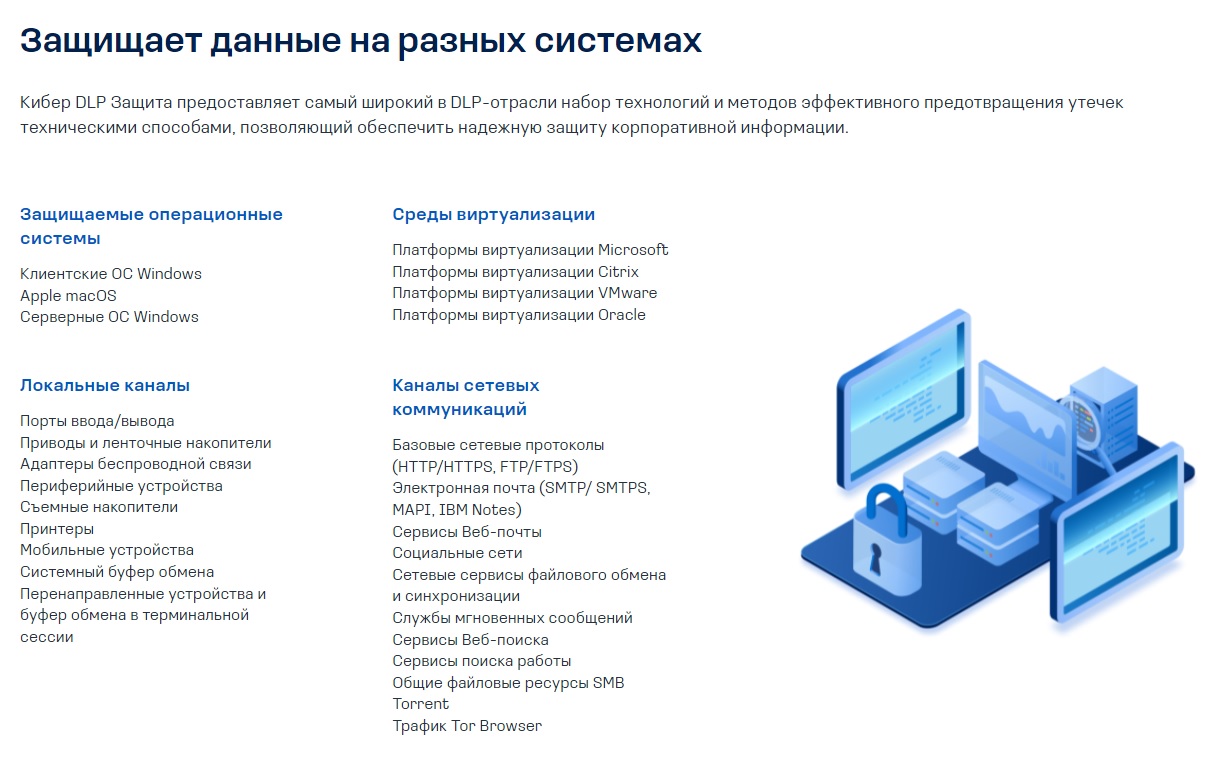 Кибер DLP Защита обеспечивает комплексную защиту от утечек данных с корпоративных компьютеров, серверов и виртуальных сред. Богатый арсенал методов контроля передаваемых и хранимых данных позволяет эффективно решать задачи предотвращения утечек информации, мониторинга операций передачи конфиденциальных данных, а также обнаружения нарушений политики их хранения.