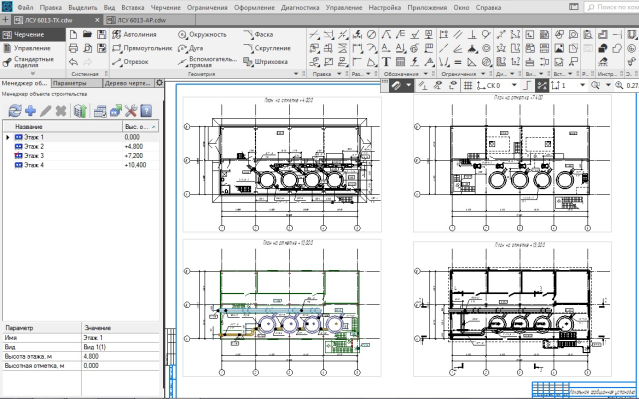 - инструменты для создания многолистовых чертежей, большой перечень готовых форматов оформления;