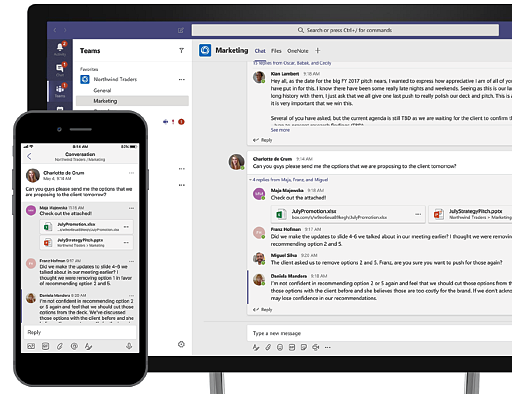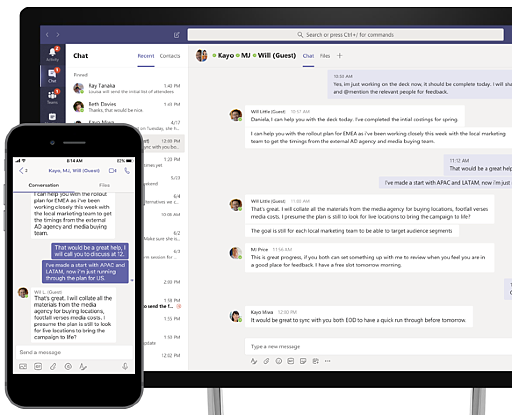 В командах, люди могут выбирать, как общаться. Они могут участвовать в групповых чатах или в командных разговорах, которые видны всей команде. Чаты являются потоковыми, постоянными и контекстными, что позволяет вашей команде легко понять контекст разговора. Командные беседы открыты по умолчанию, что позволяет вашей команде обмениваться информацией открытым и прозрачным способом.