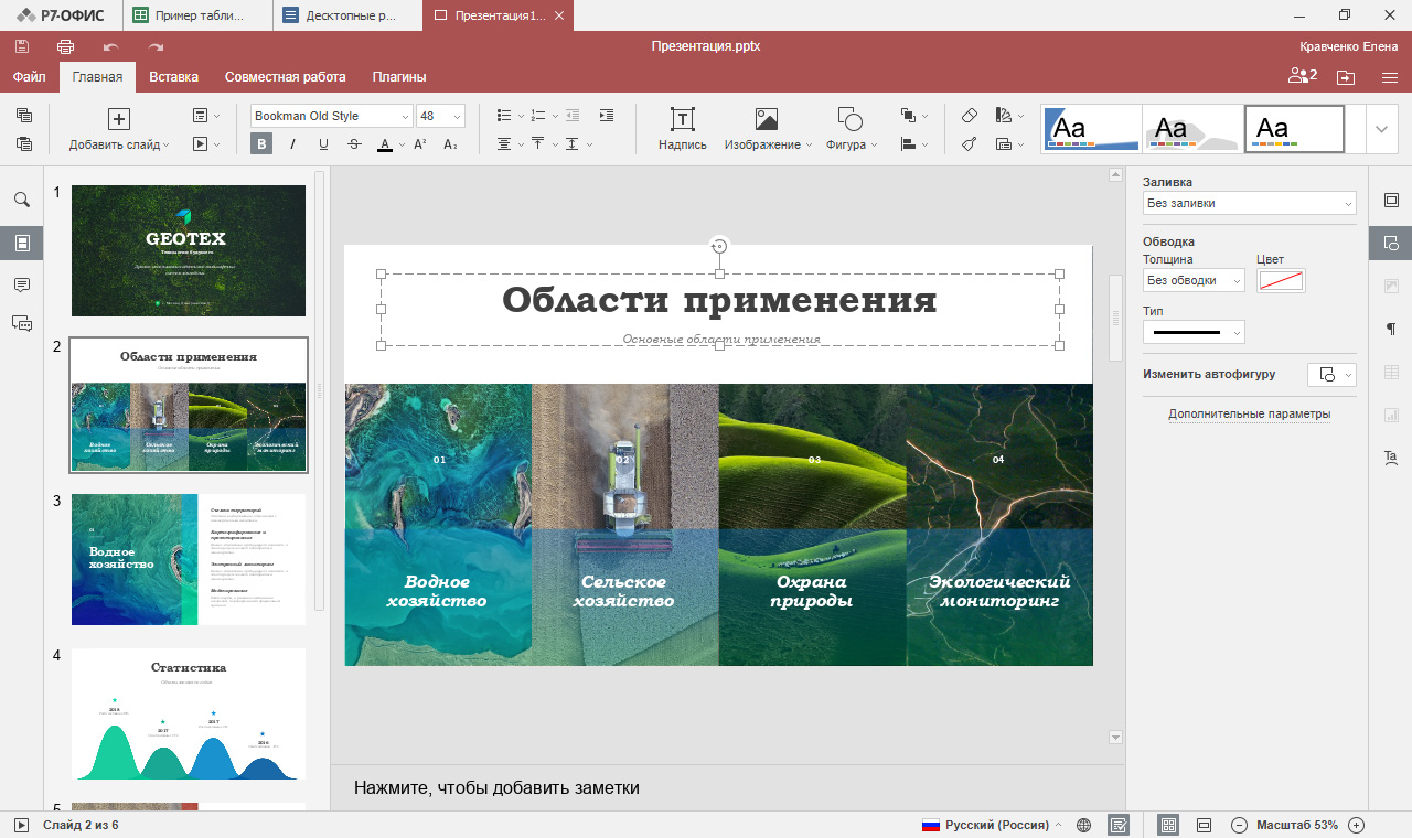 Создавайте яркие демонстрационные материалы. Просматривайте и редактируйте презентации в формате PPTX, PPT, ODP.