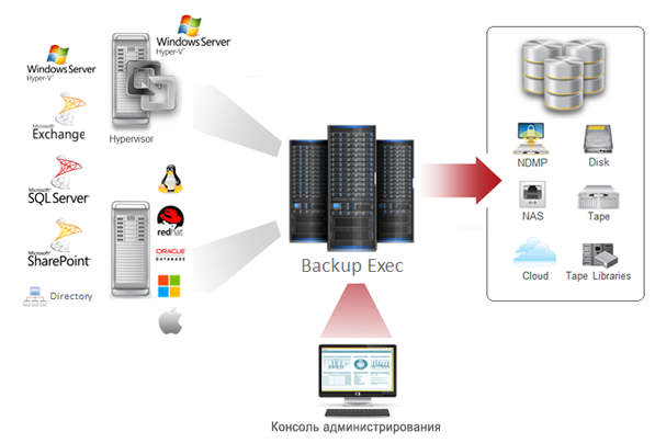 Централизованное управление резервным копированием, восстановлением и хранением данных одного или нескольких устройств с помощью единой консоли Backup Exec Server. Возможность настройки удаленного администрирования с любого сервера или рабочей станции. А так же использование в сочетании с программой управления и мониторинга ИТ инфраструктуры Microsoft System Center Operation Manager.