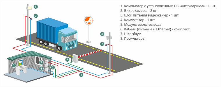 Программное обеспечение (ПО) «Автомаршал» устанавливается на компьютер с операционной системой семейства Windows. К компьютеру по сети Ethernet подключается одна или более IP-видеокамер. Система распознает номера автомобилей за счет анализа видео, поступающего с камер, и сохраняет информацию обо всех проехавших автомобилях (дата/время проезда, направление проезда, изображение автомобиля, номер автомобиля, наименование камеры, комментарии и др.) в базу данных. Функционал системы позволяет создавать пользовательские списки доступа, формировать различные виды отчетов, загружать сторонние базы данных, управлять шлагбаумами и светофорами, взаимодействовать со СКУД и системами видеонаблюдения.