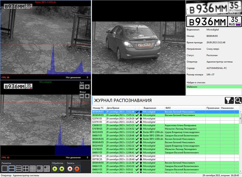 - визуальное и звуковое оповещение оператора при совпадении распознанного номера с записью в пользовательских базах данных автомобилей