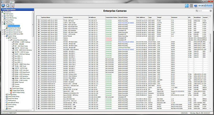 Возможность вывода на один экран всех камер сети. Поддерживается сортировка по различнымпараметрам: по соединению, статусу записи, IP-адресу, версии прошивки и др. Двойнымкликом вызывается экран настройки камеры, правой кнопкой воспроизведение черезexacqReplay.