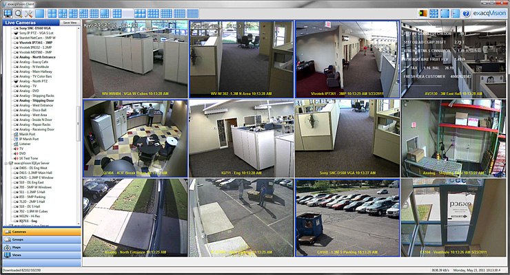 - NEW - Корпоративные камеры. Функция отображения картинки от всех входящих в сеть камер на одном экране. Поддерживается сортировка по соединению, статусу записи, IP-адресу, версии ПО и др. Двойной клик по изображению вызывает меню настройки камеры. Клик правой кнопкой - вызывает отображение живого видео или воспроизведение через exacqReplay.
